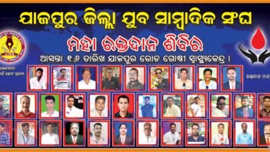 ବ୍ୟାସନଗର; ୧୬/୦୫ ( ବସନ୍ତ କୁମାର ପାତ୍ରଙ୍କ ଠାରୁ ) : ଯାଜପୁର ଜିଲ୍ଲା ଯୁବ ସମ୍ବାଦିକ ସଂଘ ଏବଂ ଯାଜପୁର ରୋଡ଼ର ଅଗ୍ରଣୀ ସ୍ବେଚ୍ଛାସେବୀ ସଂଗଠନ…